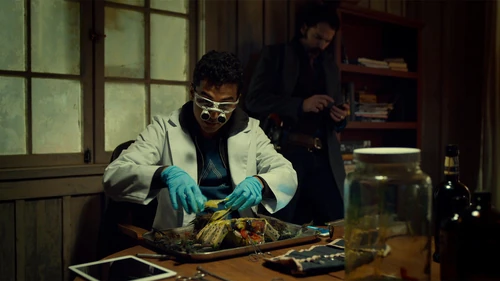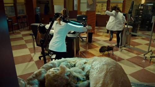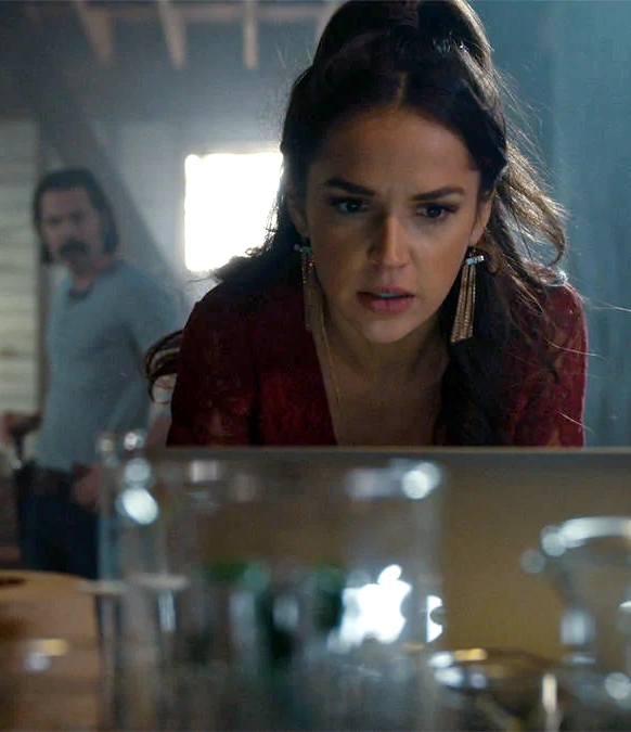 Meanwhile, Sheriff Nedley is prepared to Doc the deed to Shorty's Saloon, the one he used to own, providing he clean it up and maintain it. Which, let's face it, are not Doc's strong suits. Now, convincing a half-hearted bartender with whom he may have had past relations is more in his wheelhouse. Doc manages to convince an old flame of his, Rosita, to both sling Madori Sours and help him get a chem lab set up in his basement. What they're doing with all those test tubes and beakers is still a mystery, though. Meanwhile, Waverly and Wynonna crack open the cocoon Wynonna found at the camp site at the Black Badge satellite office, and when they do, it lets loose a small spider/demon creature that runs rampant. In lieu of a bucket of Raid, Waverly traps the creature under the trash can as Wynonna kills it with Peacemaker.