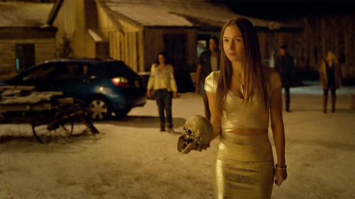 While Doc fends off the zombified gang, Waverly takes the skull and sneaks outside to confront the Stone Witch. The Stone Witch tells her that Wyatt killed her sons but that they did not rise because they were not human...say WHAT? When the Stone Witch threatens to take the skull from Waverly alive or dead, the younger Earp sister hurls the noggin against a sidewall, and it shatters to pieces. The Stone Witch is understandably peeved. She works her weird magic, and sends Waverly flying against the barn door. And she might have killed her if Doc and Wynonna didn't show up, and scare her off. Doc shoots at her and grazes her arm and then he notices that somehow he's now bleeding too from the same arm. How curious. Something tells us the Witch will be back, and maybe she'll be driving the newest model Cadillac.