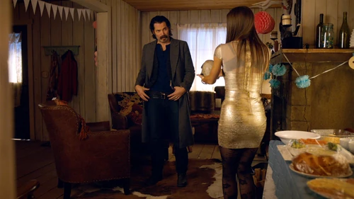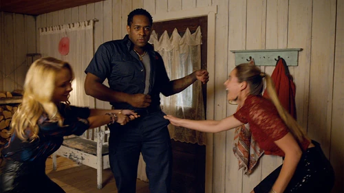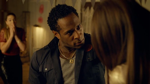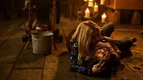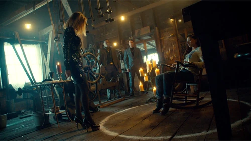 Meanwhile, the witching hour is upon the Earp house, and as Doc (having reneged on his promise) gets ready to open a can of Stone Witch whoopass. One of her henchmen has already weaseled his way into the party disguised as a stripper. Doc takes care of one of the witch's lackeys, while Waverly stabs the other in the head with some scissors. Not your average host, not your average party. Unfortunately, the Stone Witch's henchmen — and now the Blacksmith — remain under her spell, and continue to terrorize Waverly and Doc, and kill one of Waverly's so-called friends. They need backup: Wynonna.