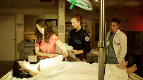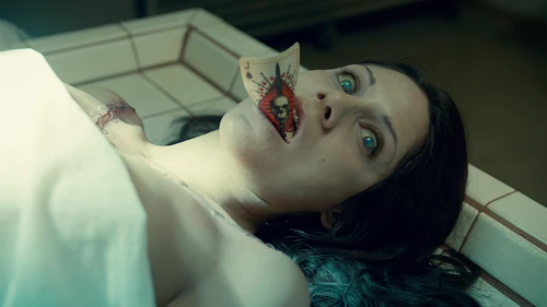 The post-mortem is interrupted when the trio notices someone is tiptoeing through the cooler where the bodies are kept. Psych! It was a diversion. When the three return to the corpse on the slab, they find the killer has been there, and left his calling card in the corpse's now-opened mouth: a playing card. Suit: spades. Face: Jack. Could be the excitement, could be something else, but Wynonna's nose starts to bleed inexplicably.