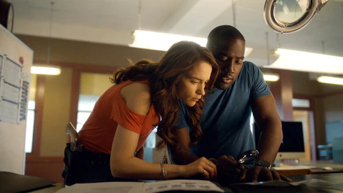 Without invitations to Waverly's party, Wynonna and Office Haught are left at the headquarters to thumb through a serial killing case. YOLO, right? The last victim, they learn after talking with an airheaded forensic scientist in the morgue, was cut open alive, had her organs removed, then oddly replaced, and then her wounds were cauterized shut by something of extraordinary heat. Oh, and on her neck is the imprint of a spade, which, for the record, looks like a hickey.